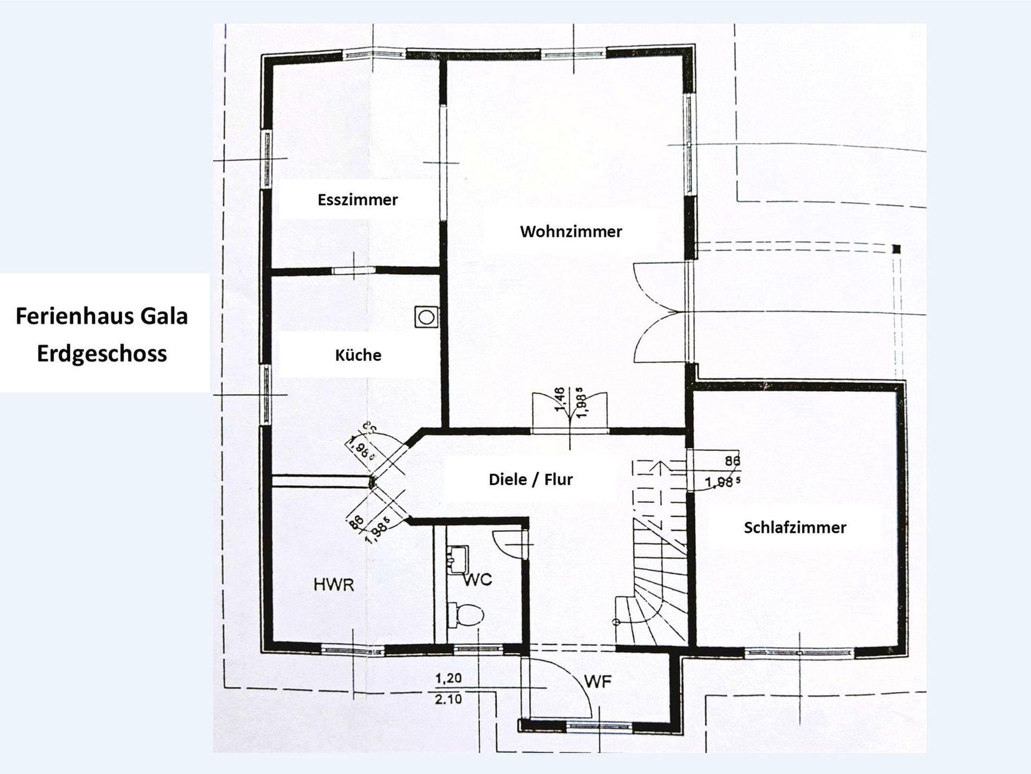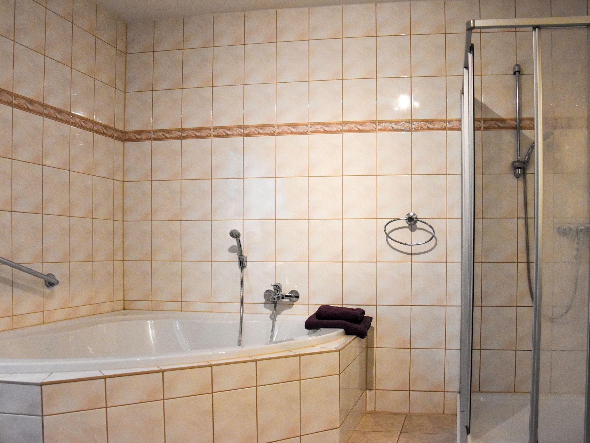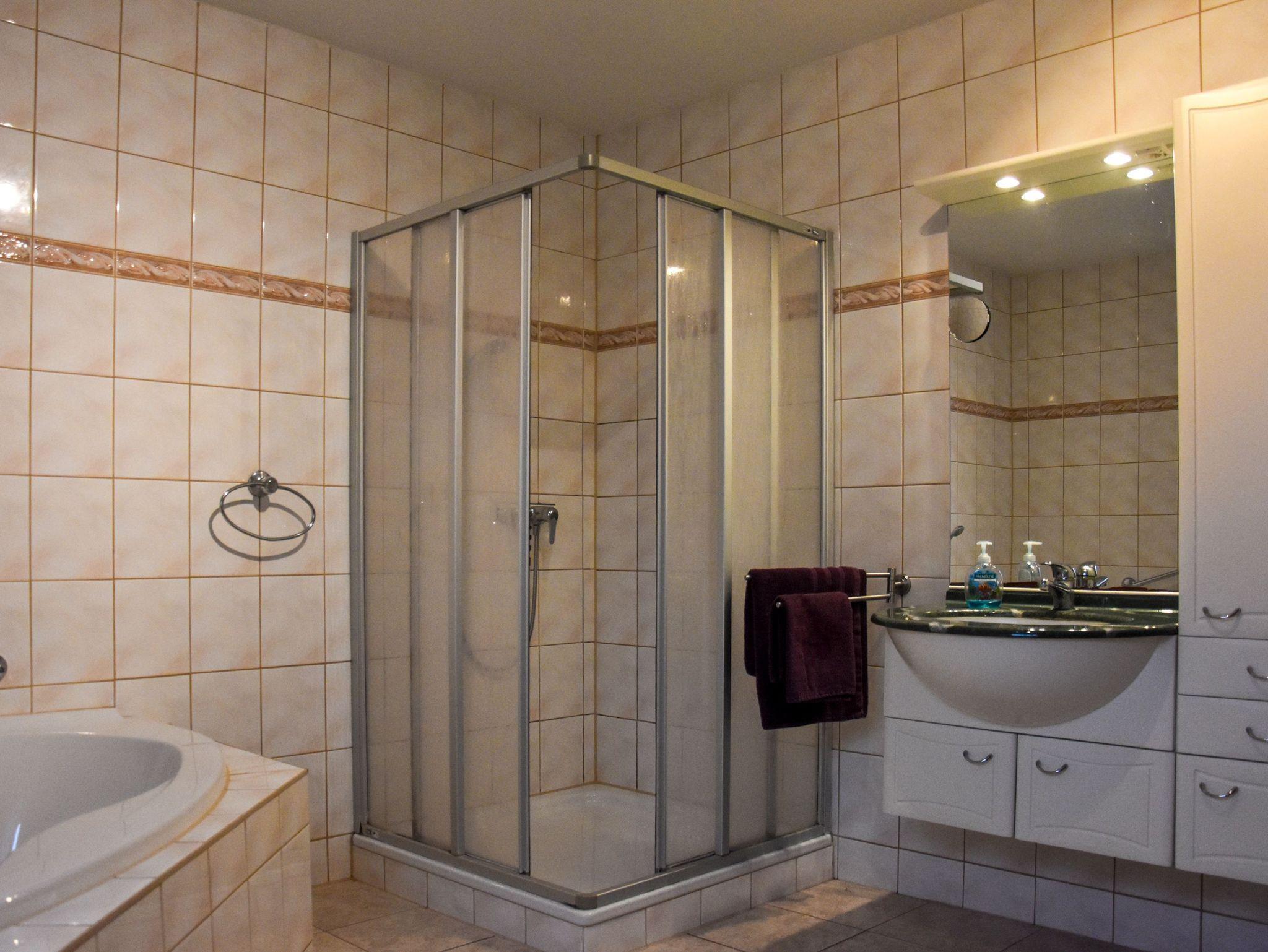 Weiterhin befinden sich im Erdgeschoss ein Schlafzimmer mit Doppelbett und ein Badezimmer mit Eckbadewanne und WC. Zusätzlich ist ein Gäste-WC vorhanden.