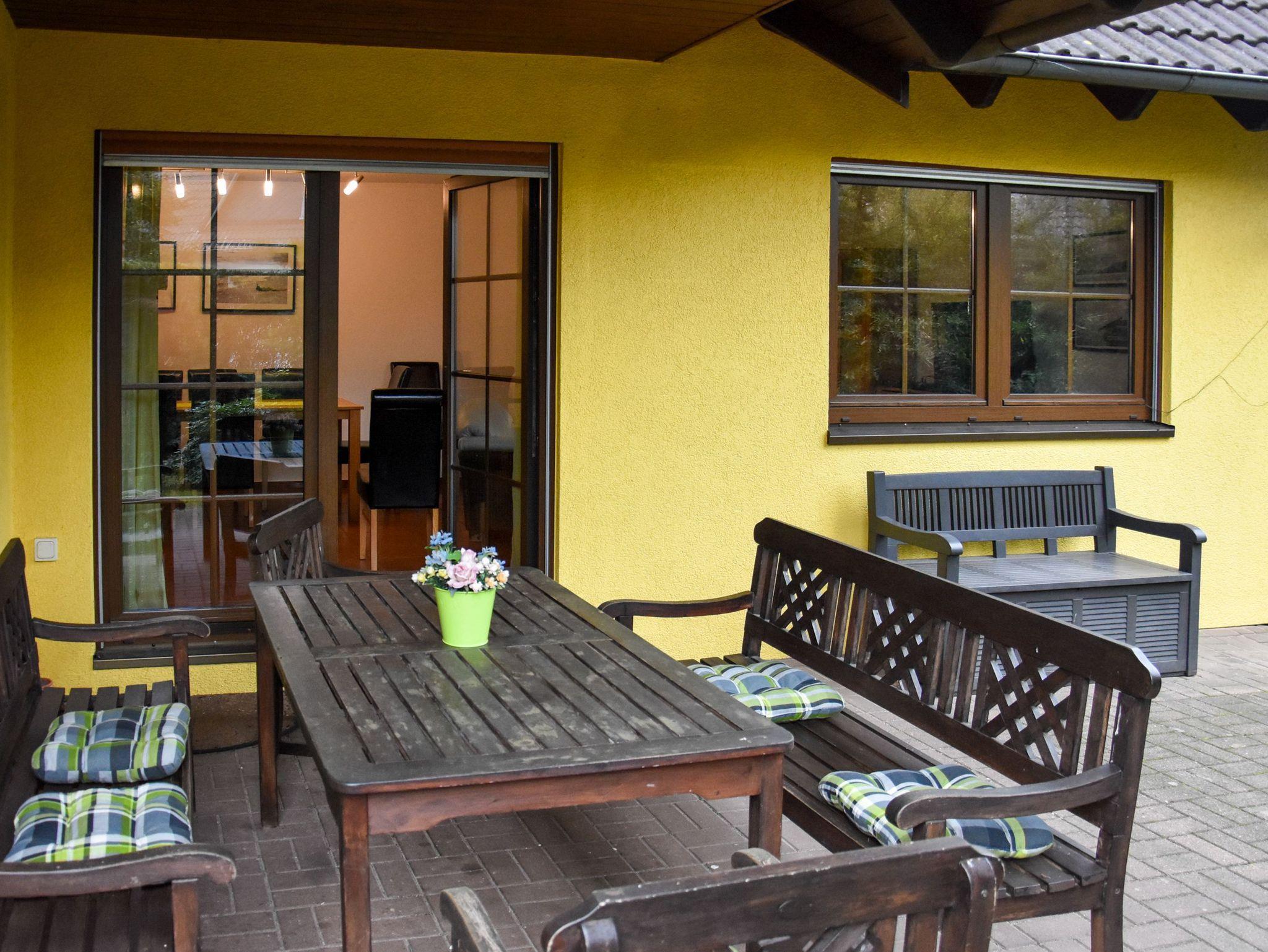 Im Erdgeschoss befindet sich der großzügige und lichtdurchflutete Wohn- und Essbereich, mit angrenzender, voll ausgestatteter Küche (Kühlschrank mit Gefrierfach, Herd, Backofen, Mikrowelle, Spülmaschine) sowie Zugang zur großen teilüberdachten Terrasse mit Mobiliar. Im Wohnzimmer befindet sich außerdem ein Flachbild-TV.
