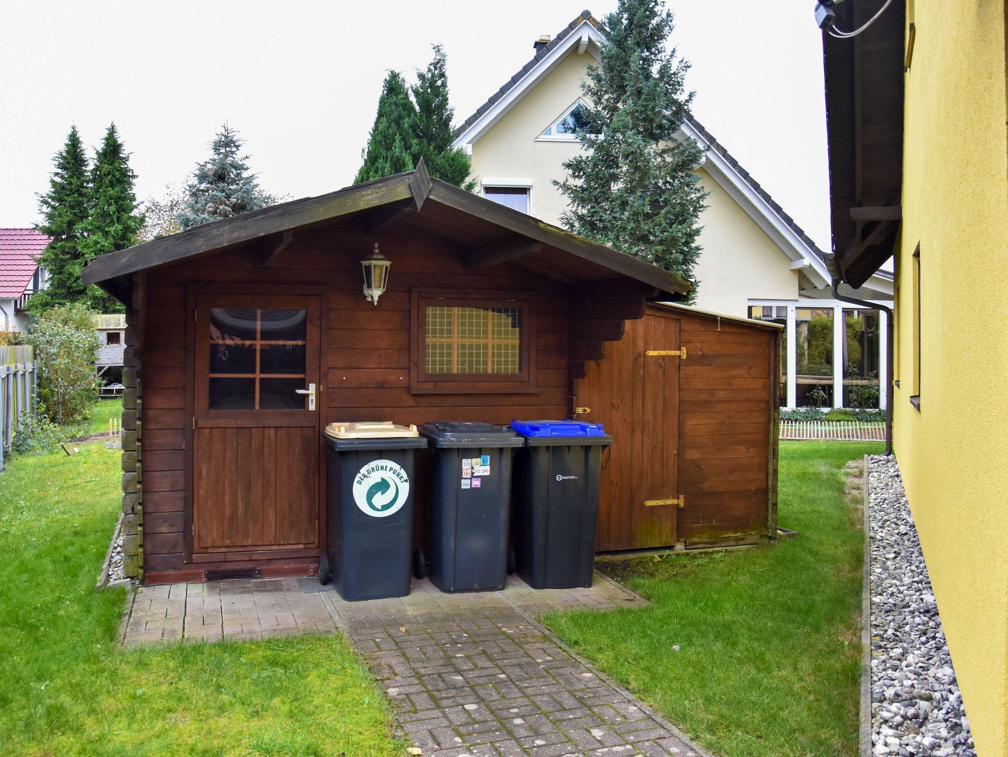 Im Außenbereich des Hauses gibt es ein Abstellhäuschen, Spielwiese, 1 Doppelcarport, sowie 2 weitere Pkw-Parkmöglichkeiten auf dem ca. 500 qm großen Grundstück.