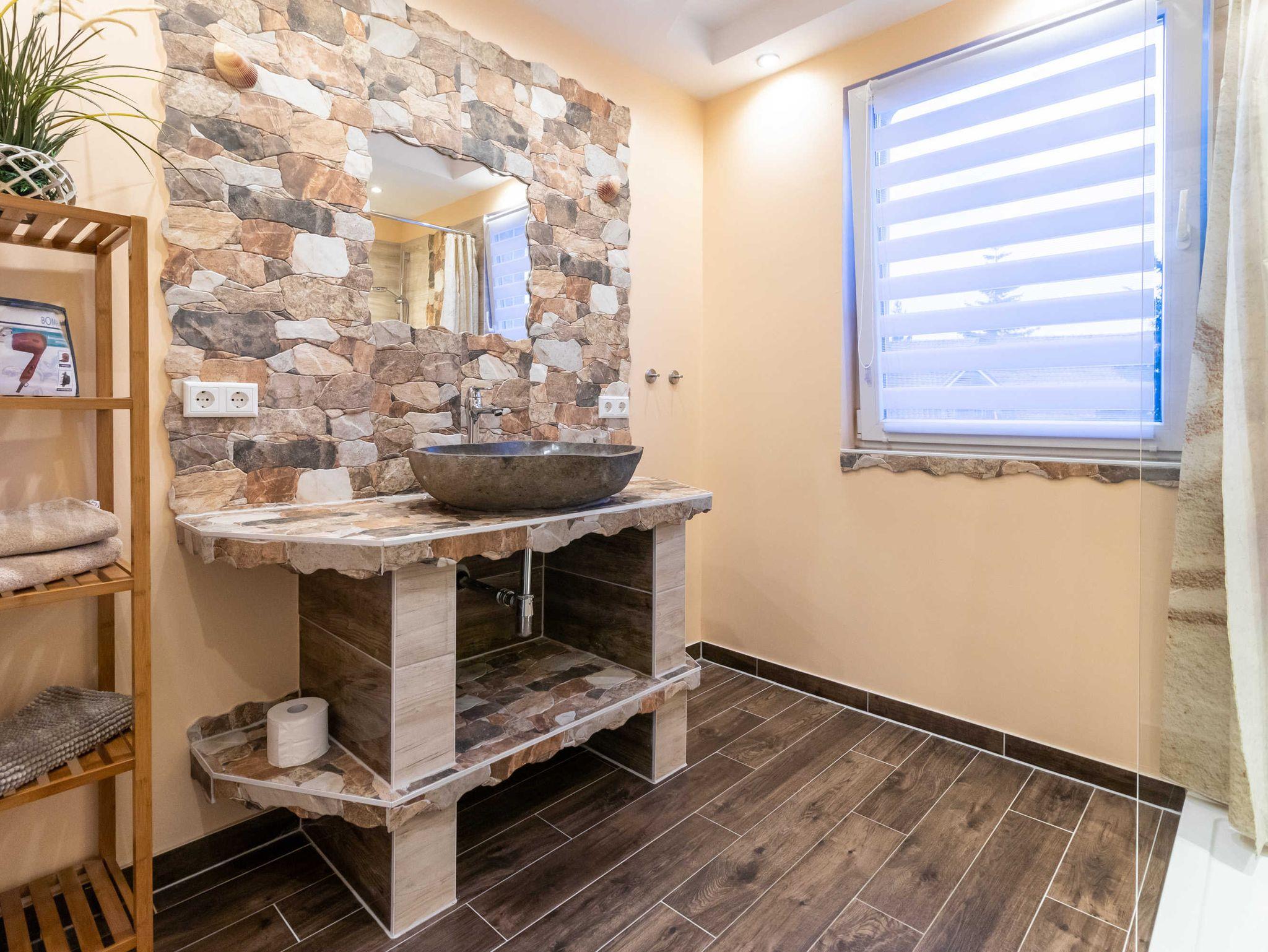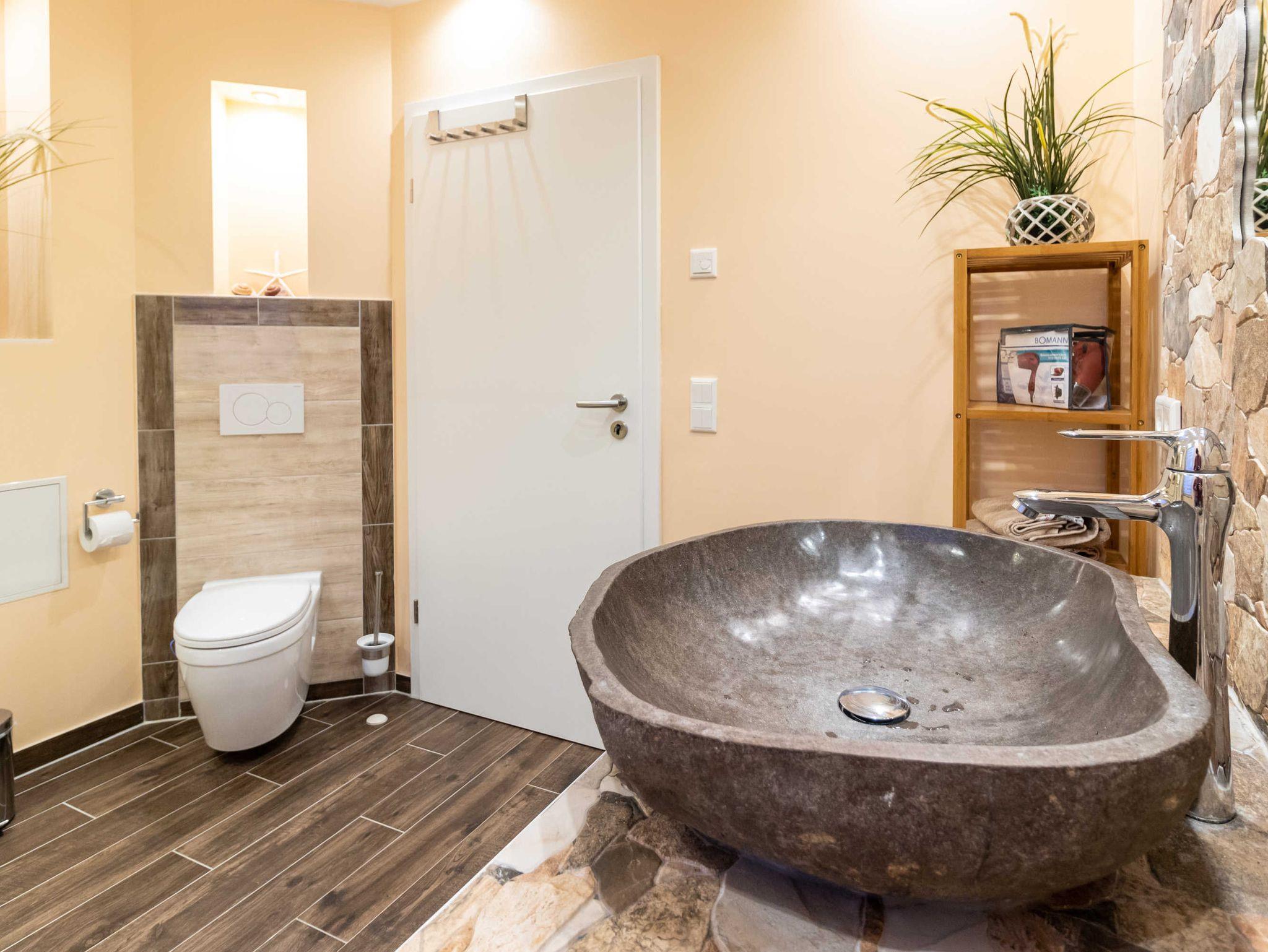(2 Erwachsene) mit 60 qm Wohnfläche, aufgeteilt in einen großzügigen Wohnbereich mit Schlafcouch, Esstisch, Balkon mit Südlage und hochwertiger, komplett ausgestatteter Einbauküche. Es ist 1 Schlafzimmer mit großem Doppelbett vorhanden. Ein indivduell mit Fliesen und Naturstein gestaltetes einmaliges Bad , sowie ein Flur ergänzen die Ferienwohnung.