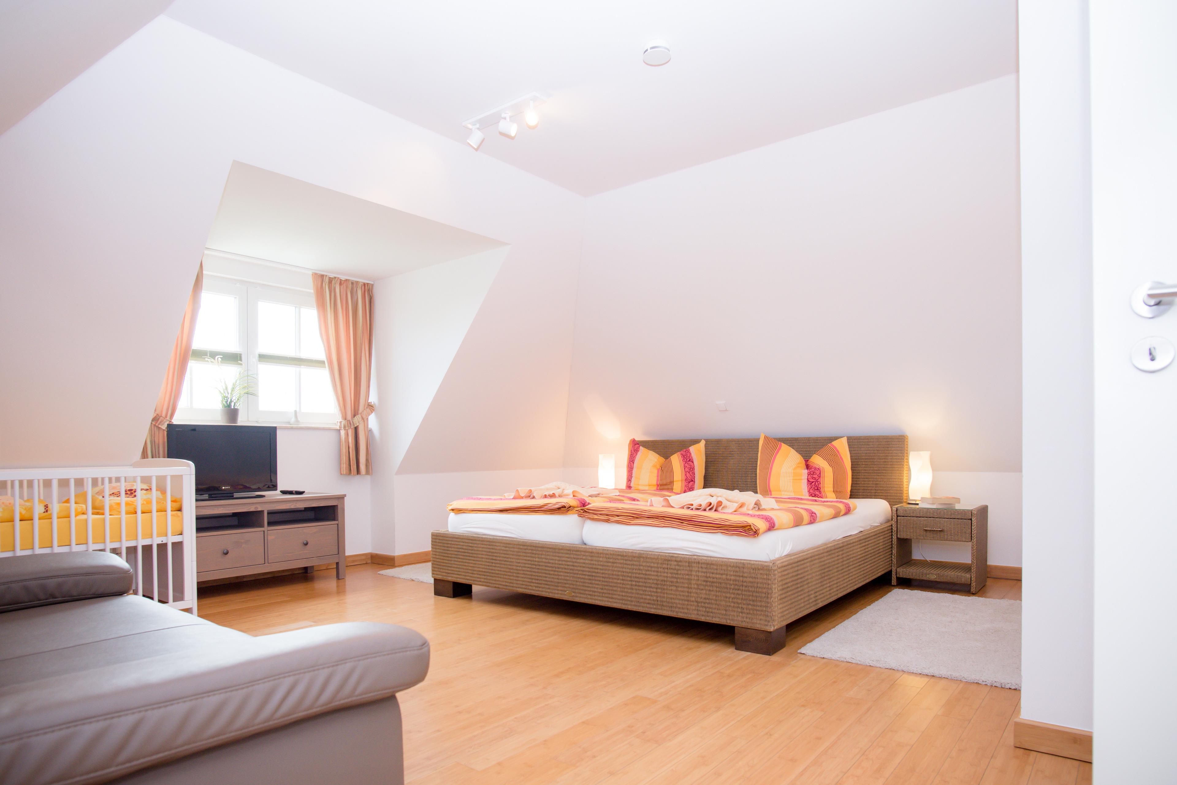 Im Obergeschoss gibt es ein weiteres Bad, ein großes Schlafzimmer mit TV und Babybett sowie ein Schlafzimmer mit Doppelbett.