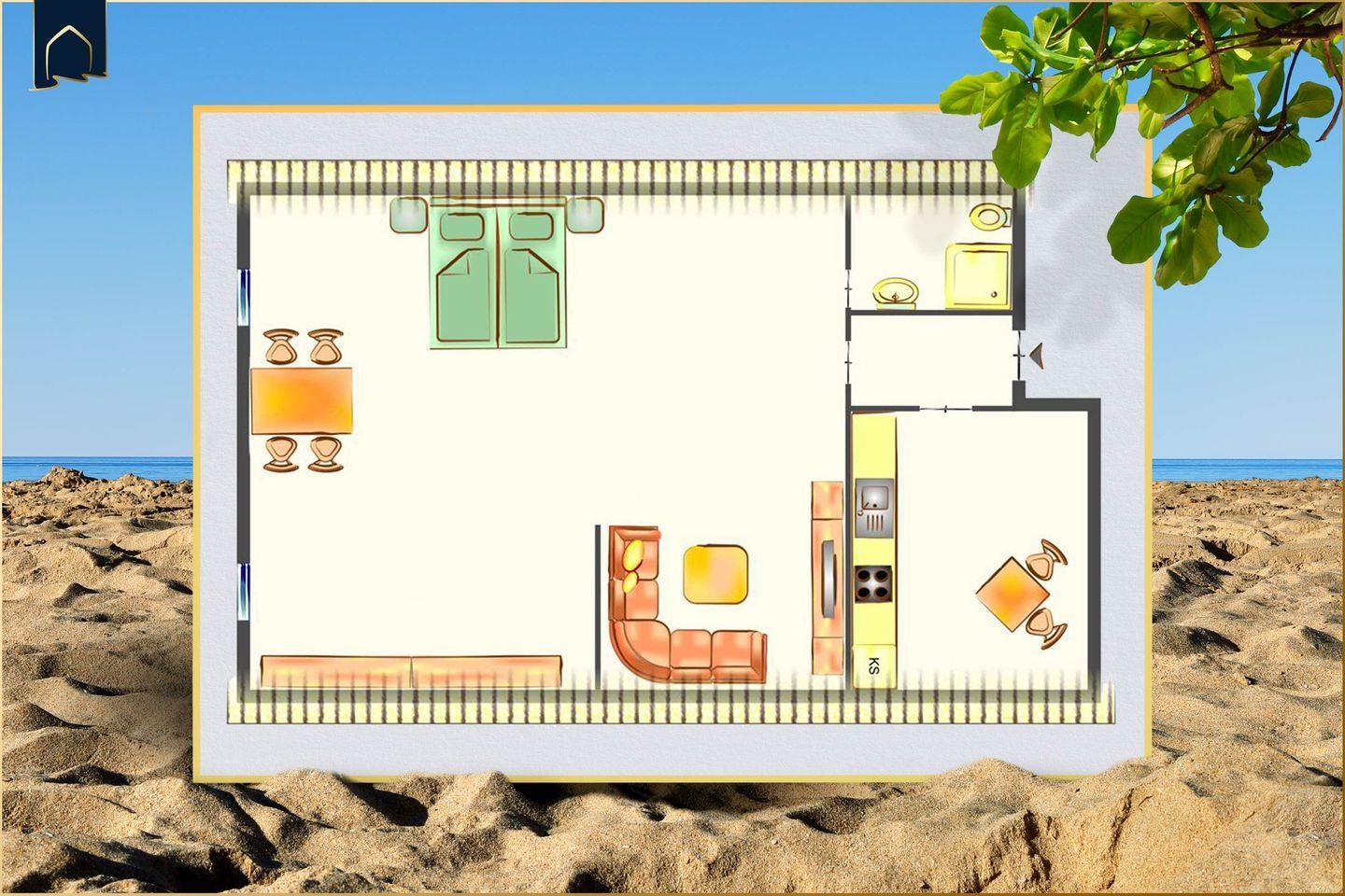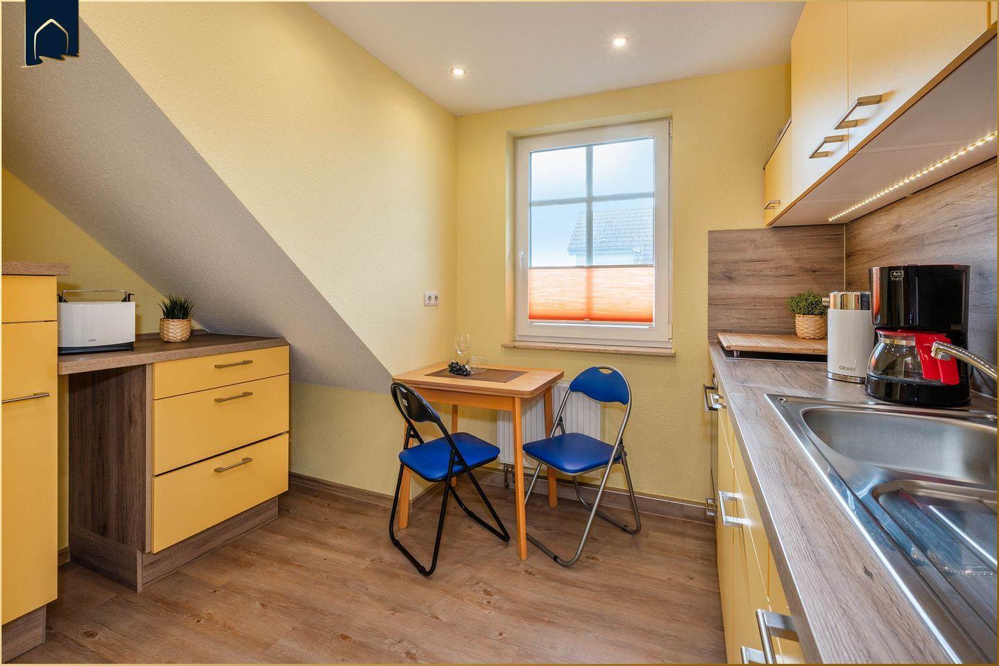 Die Wohnung verfügt über ein Badezimmer mit Dusche, WC und Waschbecken. Die voll ausgestattete Küche bietet alles, was Sie für den täglichen Bedarf benötigen: Spülmaschine, Kühlschrank mit Gefrierfach, Backofen, Herd, Kaffeemaschine, Wasserkocher und Toaster. Ein Esstisch im Wohnbereich lädt zu gemütlichen Mahlzeiten ein. Zum Entspannen steht ein bequemes Sofa bereit, auf dem man auch abends den Tag mit einem Film oder Buch ausklingen lassen kann. Für Unterhaltung sorgt ein moderner TV mit Anschluss, WLAN ist selbstverständlich kostenlos verfügbar. Feuermelder und Fliegengitter sorgen für zusätzliche Sicherheit und Komfort.