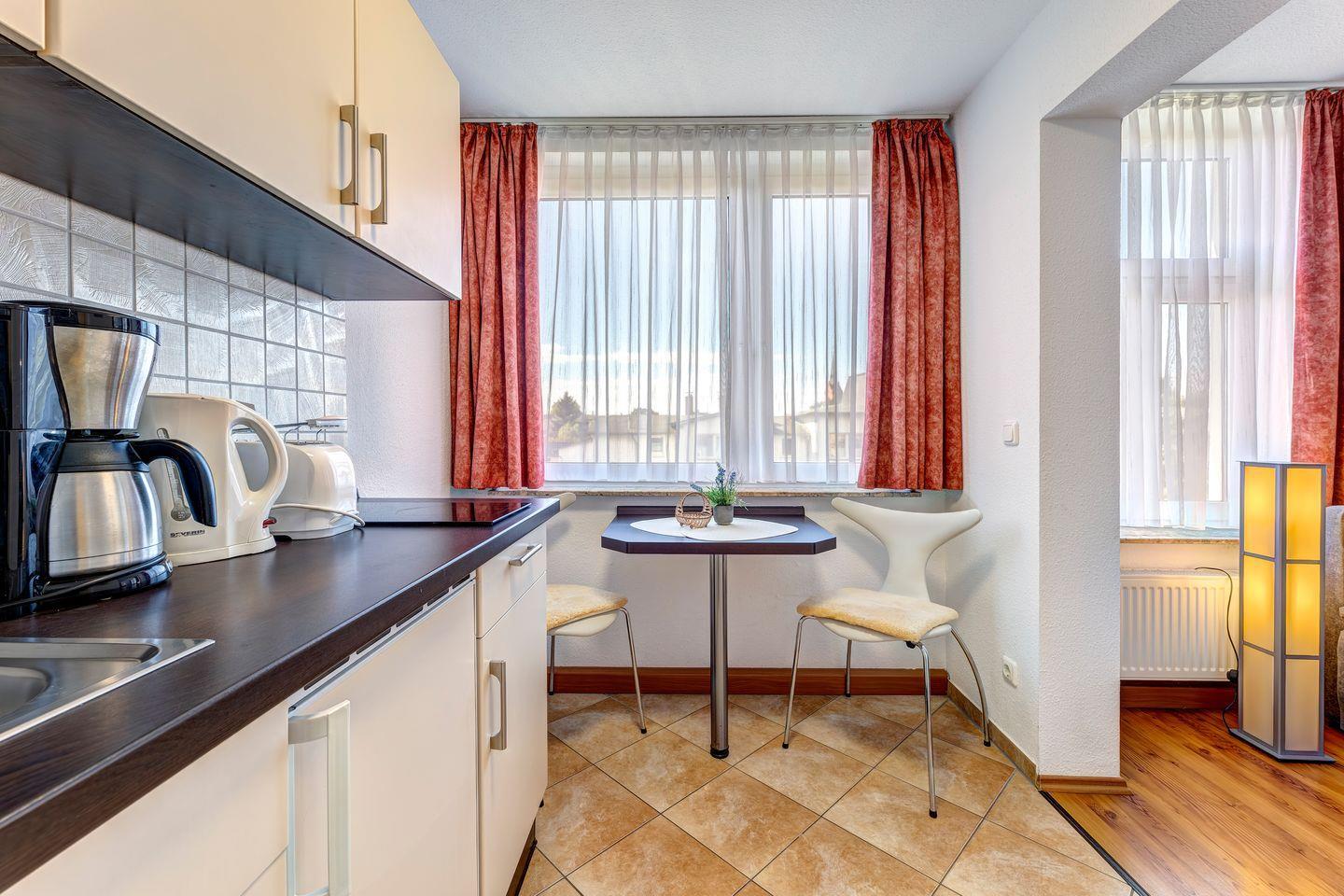 Die Ferienwohnung 1 in der 1. Etage bietet Ihnen einen großzügigen Wohn-Schlafbereich mit einem komfortablen Doppelbett (getrennte Matratzen) und einer gemütlichen Sitzgruppe mit einem ausziehbaren Schlafsofa (140 cm) sowie einem bequemen Sessel in der lichtdurchfluteten Veranda. Von hier aus genießen Sie einen herrlichen Blick auf die beeindruckende Bäderarchitektur der Umgebung. Eine moderne Küche sowie ein Badezimmer mit Dusche und WC komplettieren die Ausstattung.