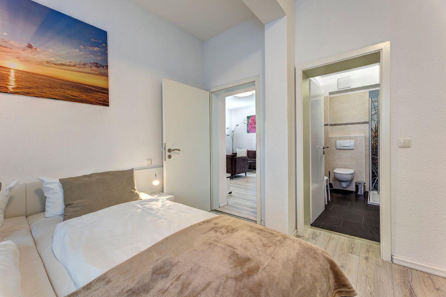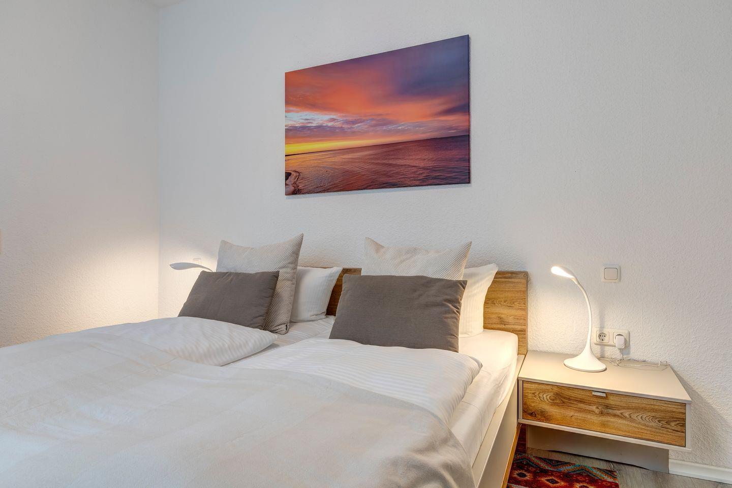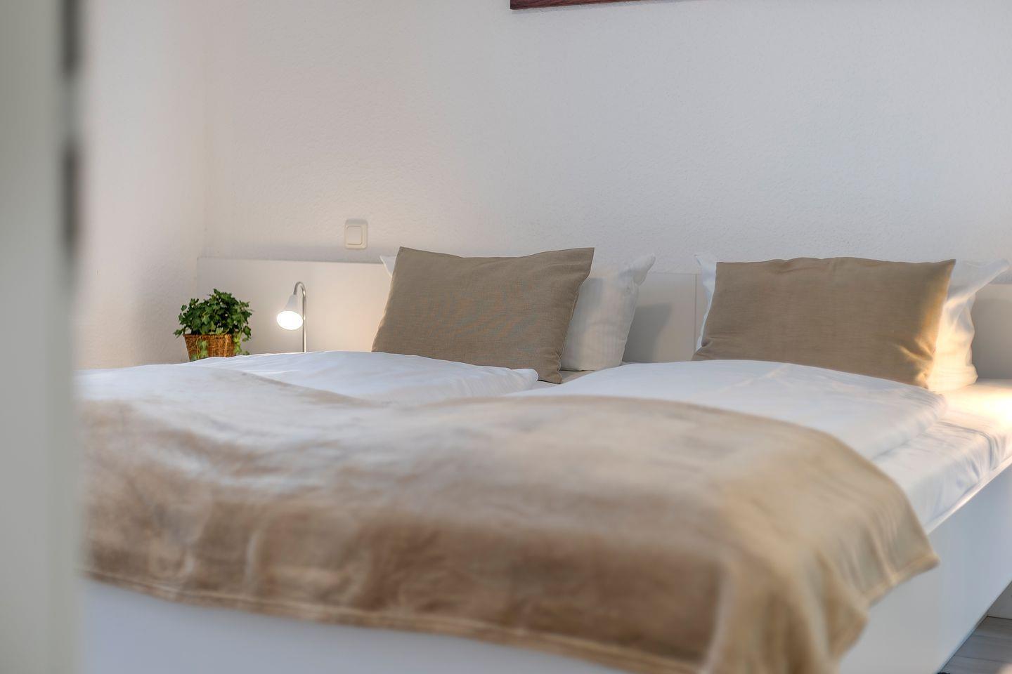 Zwei behagliche Schlafzimmer mit komfortablen Doppelbetten garantieren erholsame Nächte. Das Hauptschlafzimmer beeindruckt mit begehbarem Kleiderschrank (offene Regale) und eigenem Bad mit Dusche und WC. Ein weiteres Bad mit Dusche und WC sorgt zusätzlich für Komfort.