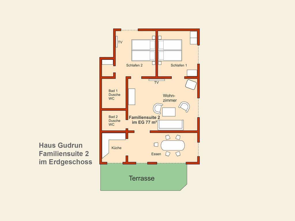 Die Familiensuite 2 im Haus Gudrun bietet auf 77 m² zwei Schlafzimmer, ein offenes Wohnzimmer mit Küche, zwei moderne Badezimmer mit bodengleichen Duschen sowie eine Terrasse. Zur Ausstattung zählen WLAN, TV, Zentralheizung und ein eigener Parkplatz. Die Unterkunft ist familienfreundlich und für Nichtraucher geeignet.