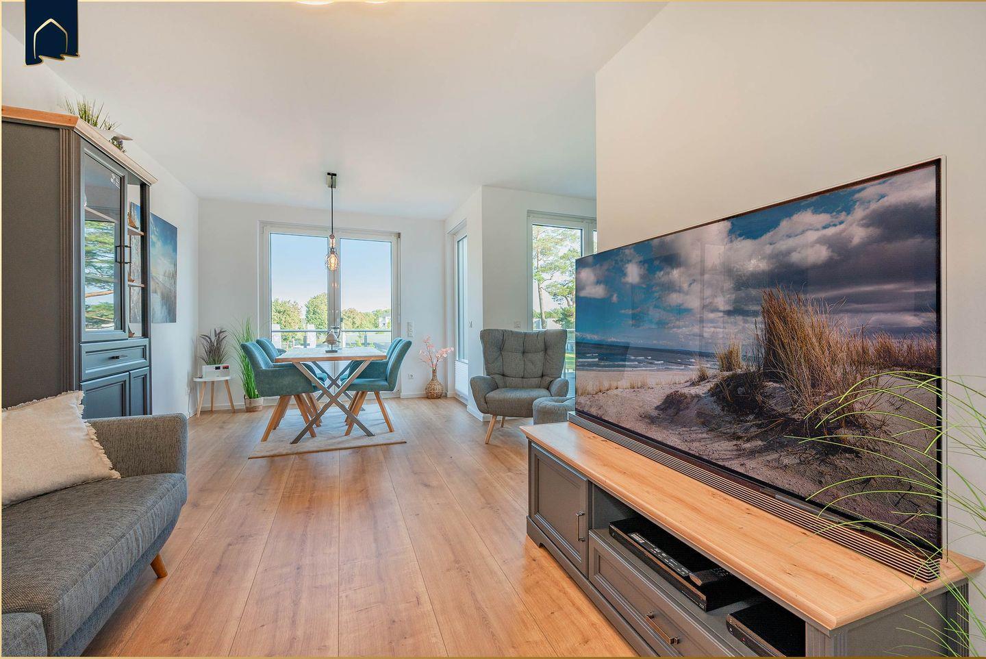 Willkommen in dieser hochwertig ausgestatteten Ferienwohnung, die durch ihre ruhige Lage mitten im Grünen und gleichzeitig durch moderne Annehmlichkeiten überzeugt. Mit rund 95?m² Wohnfläche bietet sie Platz für bis zu 4 Personen und eignet sich hervorragend für Paare, Familien oder Freundesgruppen, die Komfort und Naturerlebnis miteinander verbinden möchten. Die Ferienwohnung liegt unmittelbar am Stettiner Haff – perfekt für alle, die Ruhe suchen und dennoch eine gute Anbindung zu den Highlights der Umgebung schätzen.