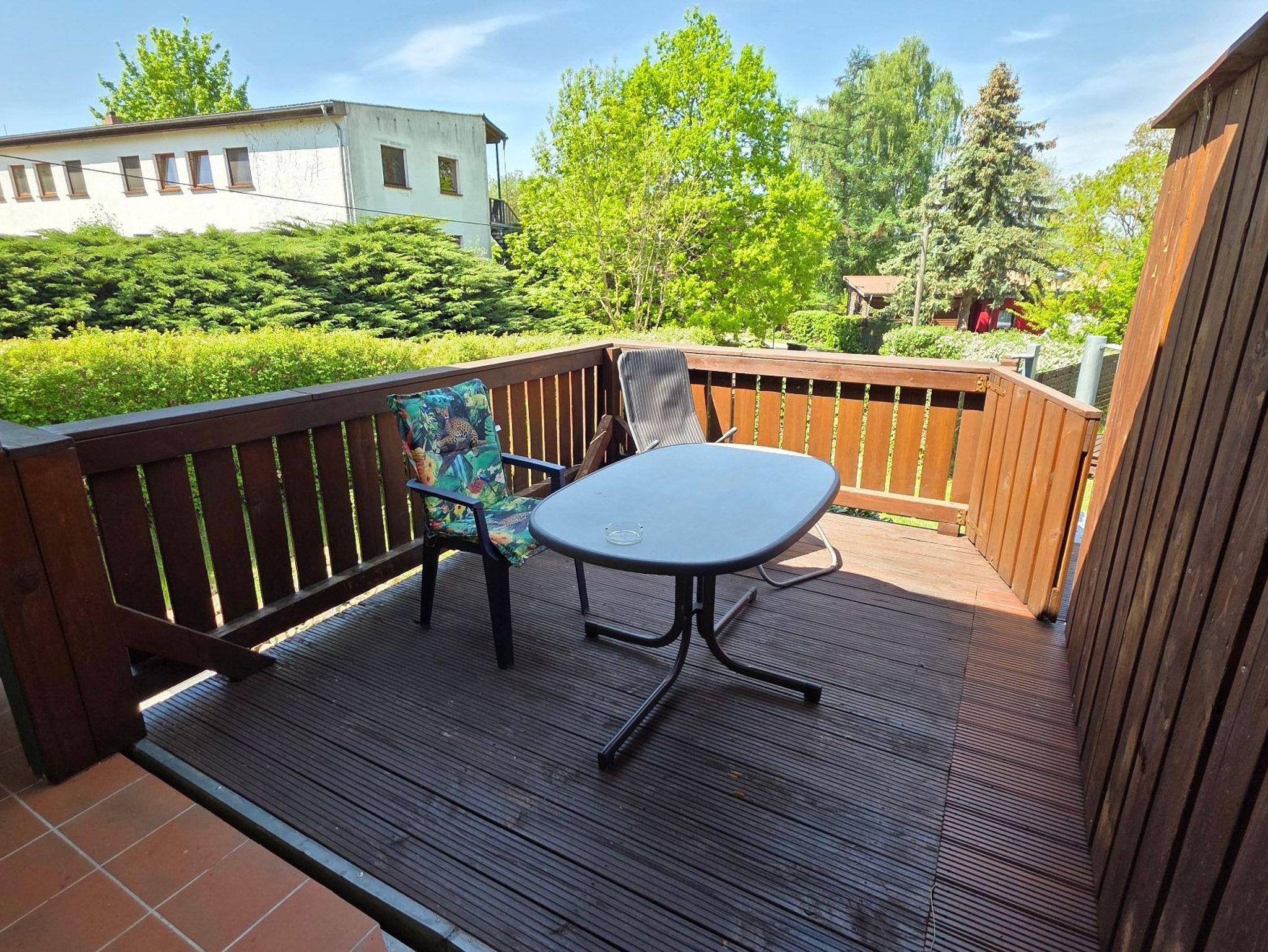 Die Ferienwohnung 5 mit befindet sich in der Ferienanlage Haus am See mit 98 qm auf 2 Etagen (Obergeschoss: Wohnzimmer mit Essplatz, große separate Küche, Gäste-WC, Dachgeschoss: 2 Schlafzimmer mit Doppelbett, 1 Schlafzimmer mit Einzelbett, Bad/Wanne/WC, ). Aus dem Wohnzimmer gelangt man direkt auf den großen Südwest-Balkon. Vom Balkon gelang man über eine Spindeltreppe.