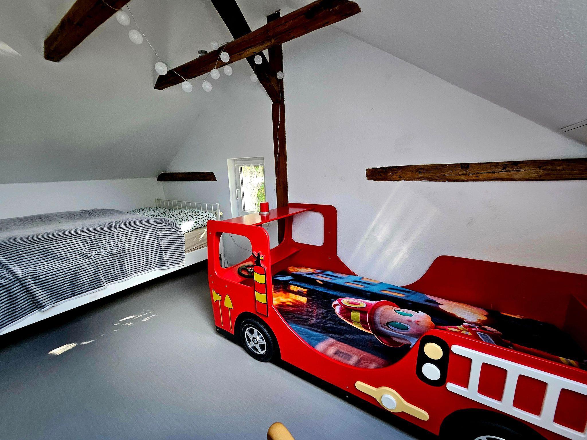 Für die Kids: Kinderbett/Feuerwehrbett: 2,00m x 0,90m; Reisekinderbett Babys (auch als Laufgitter nutzbar), Wickeltisch, Bauklötzer und Spiele.