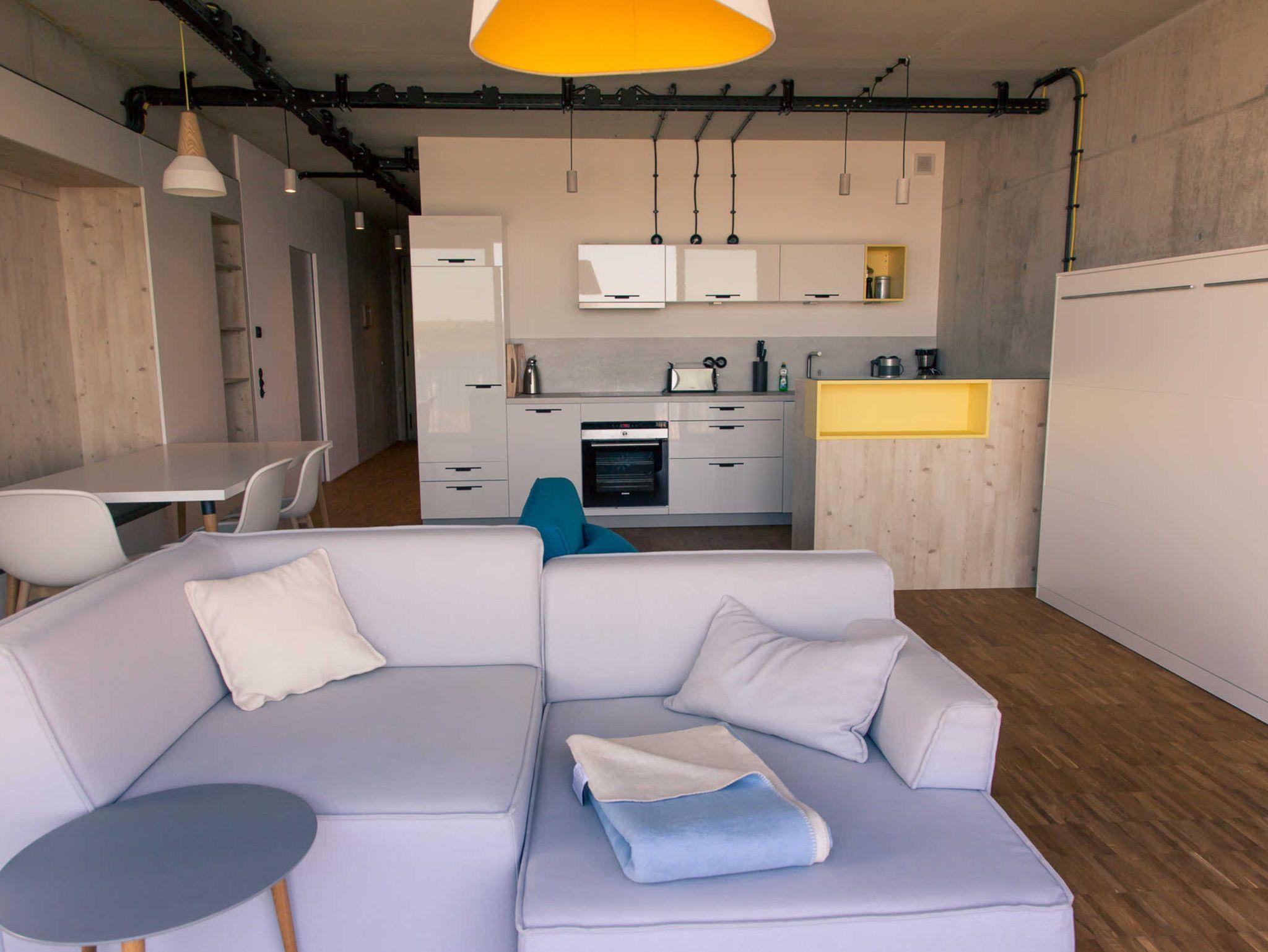 Sehr schön ausgestattetes Appartement sogar mit Infrarotkabine mit tollem Blick auf den Zwenkauer See. Durch die großen Wohnzimmerfenstertüren, die man in der Mitte komplett zur Seite schieben kann, hat man das Gefühl draußen zu sein. Das italienische Restaurant darunter ist definitiv zu empfehlen.