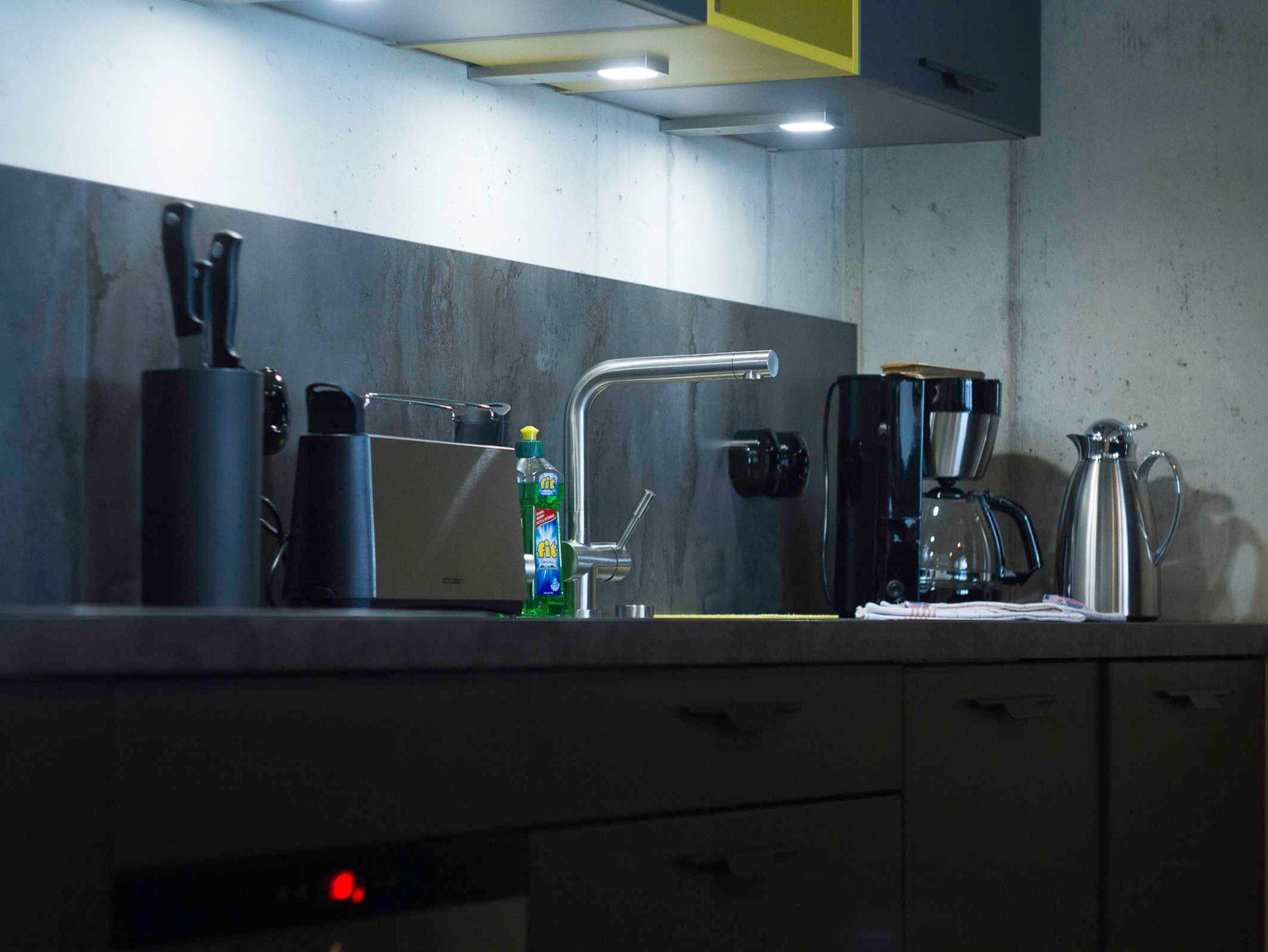 neben der Spühle eine Abtropfmöglichkeit, eine bequemere Couch und Wlan verbessern