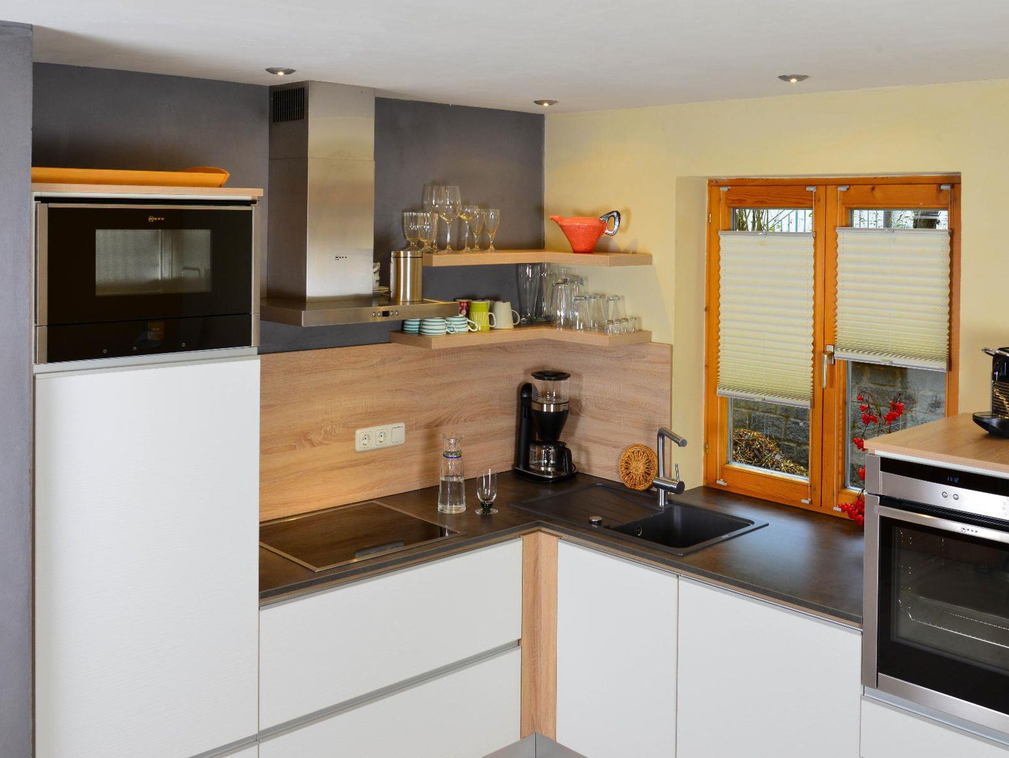 mit Backofen, Kühlschrank, Kaffeemaschine, Wasserkocher und Toaster. Im