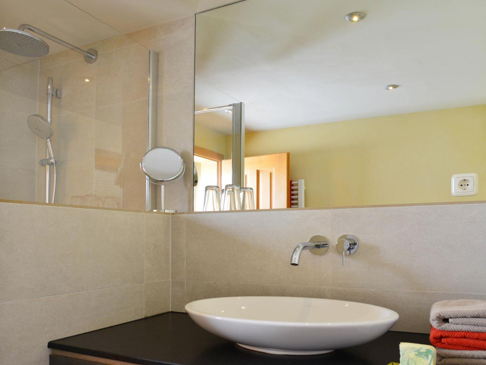 Fernseher. Das Badezimmer verfügt über WC und Dusche und einen Fön. Von