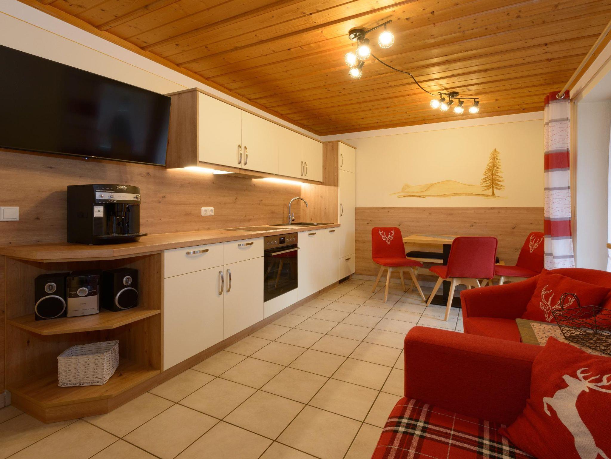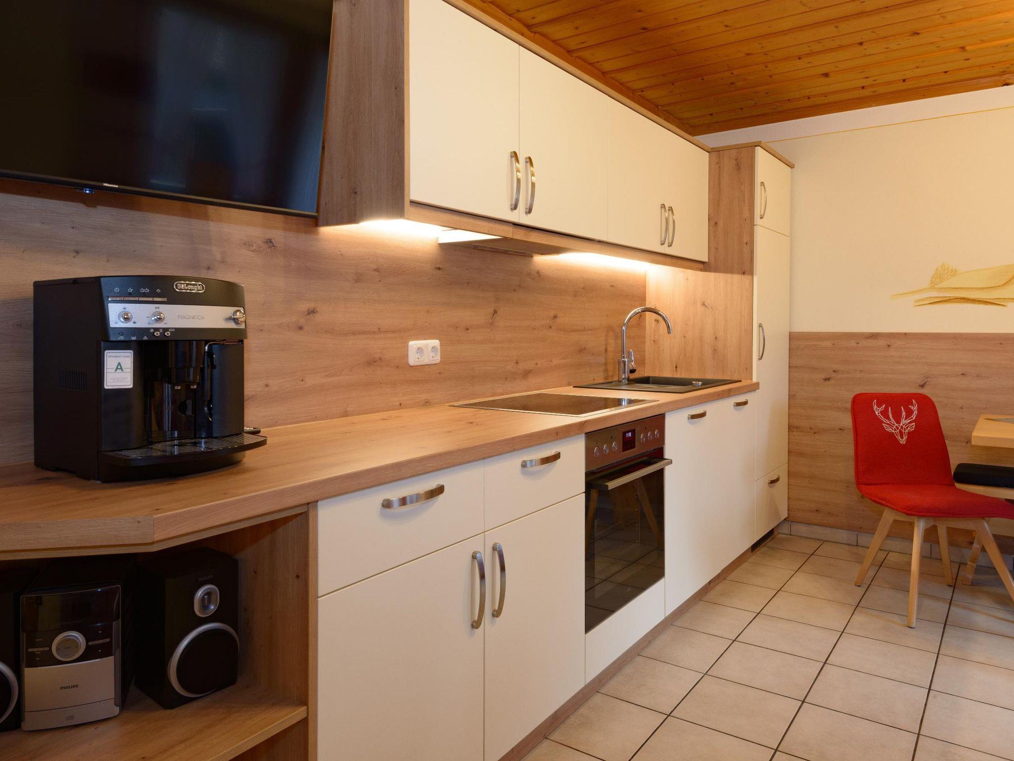 Die gemütliche Wohnküche ist mit Backofen, Spülmaschine, Mikrowelle, Gefrierschrank, Kaffeevollautomat, Wasserkocher, Toaster usw. ausgestattet. So können Sie sich auch im Urlaub ohne Einschränkungen selber versorgen. Auch eine Babyausstattung, wie Hochstuhl und Flaschenwärmer, können wir Ihnen zur Verfügung stellen.