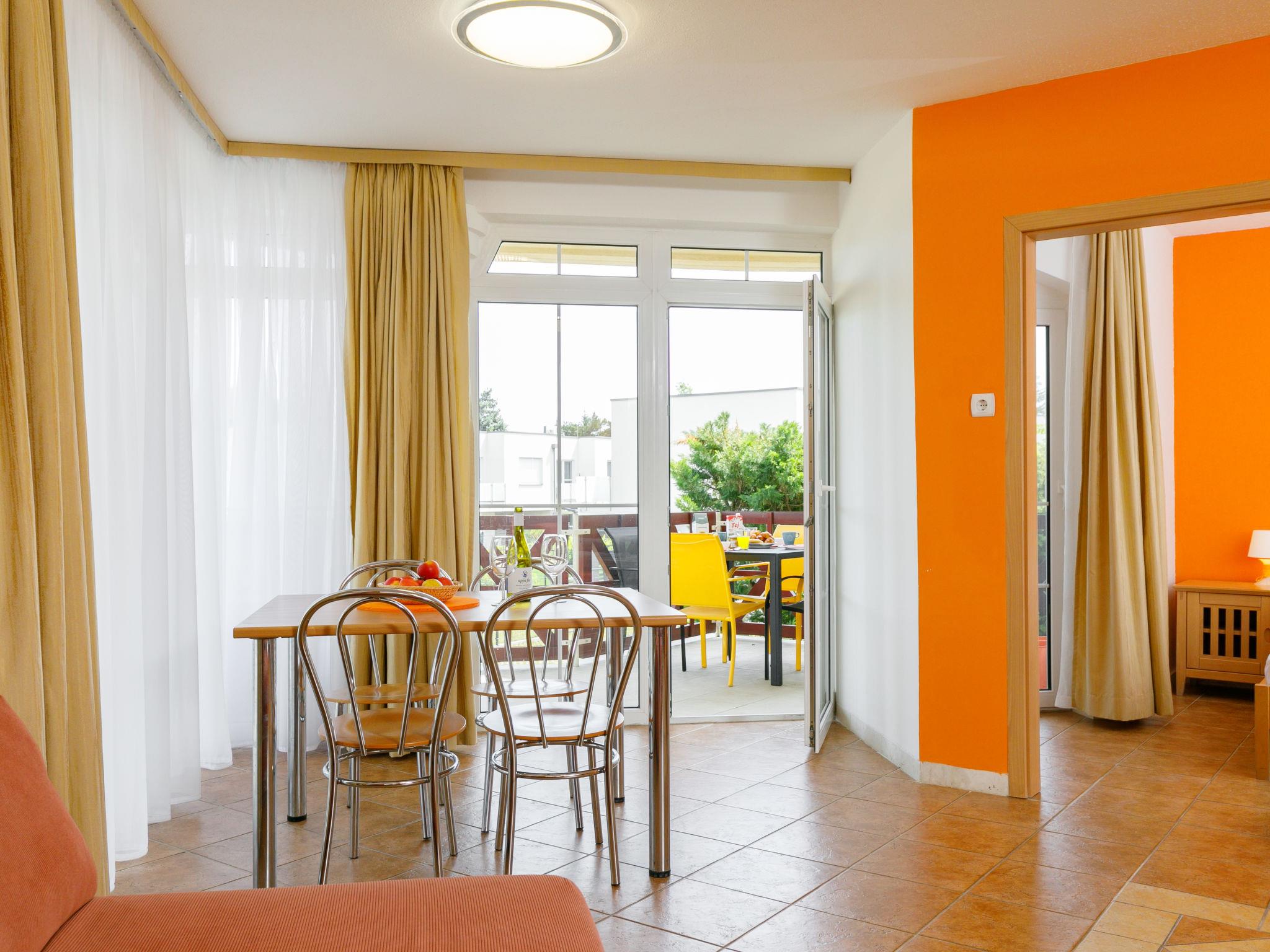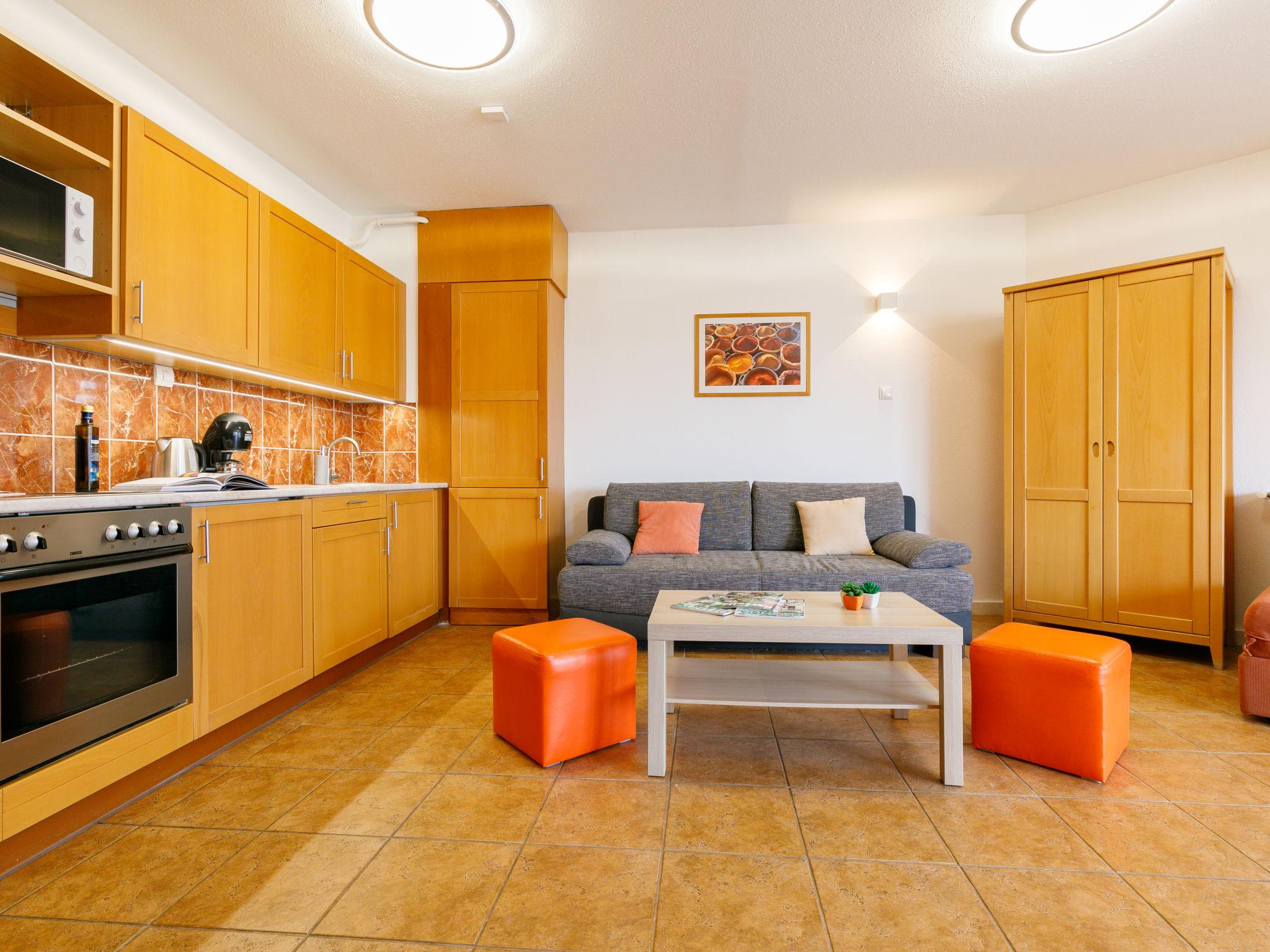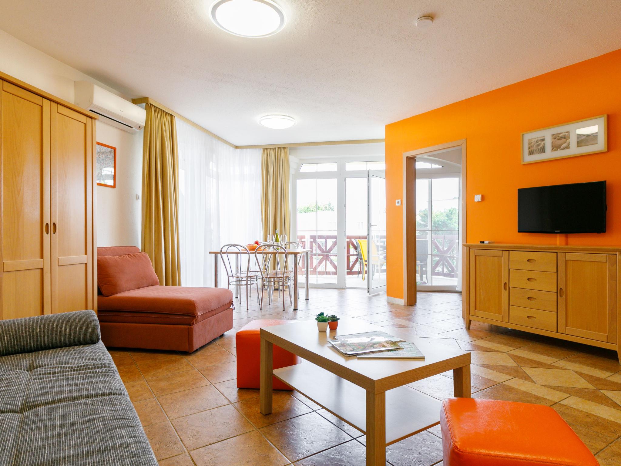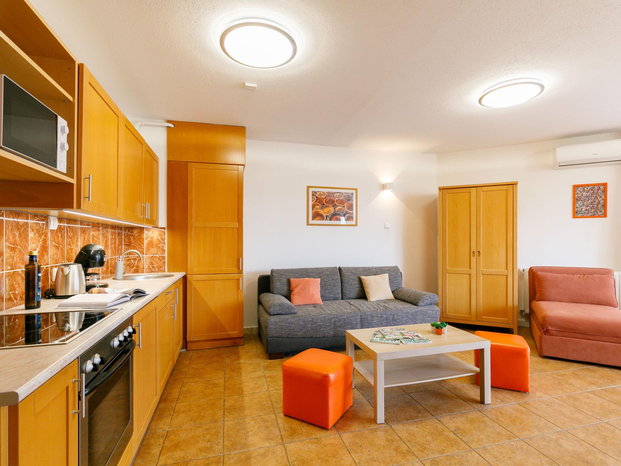 "Charlie", 2-room apartment on 1st floor, east facing position. Spacious and bright, comfortable furnishings: open living/dining room with 1 double sofabed (140 cm, length 200 cm), cable TV (flat screen), air conditioning. Exit to the terrace, east facing position. 1 double bedroom with 1 french bed (160 cm, length 200 cm). Exit to the terrace. Open kitchen (oven, 4 ceramic glass hob hotplates, kettle, microwave, electric coffee machine). Shower/WC. Heating (extra). Terrace. Terrace furniture. Facilities: mosquito net, children's high chair, baby cot (extra). Internet (WiFi). Please note: smoke alarm.