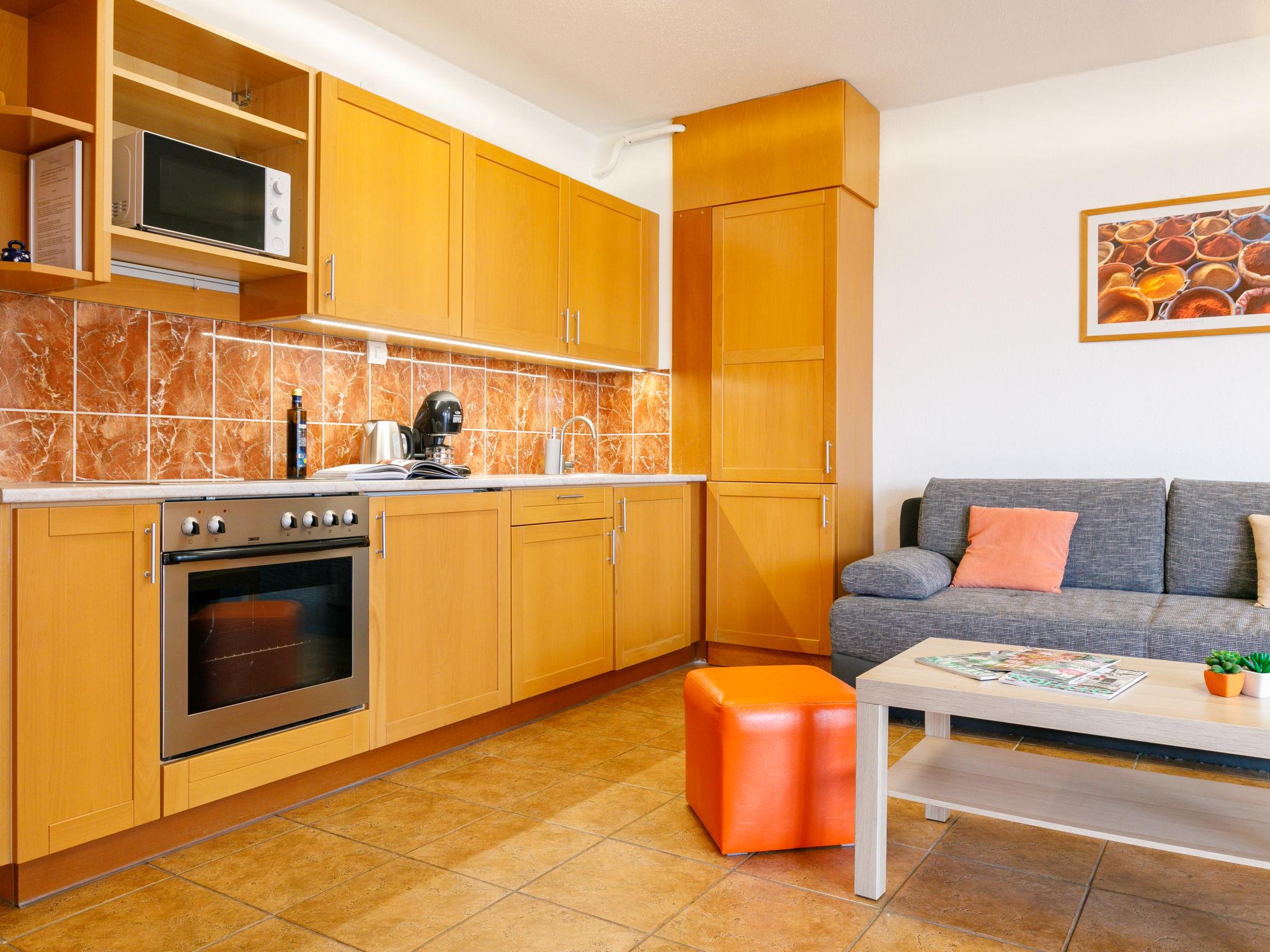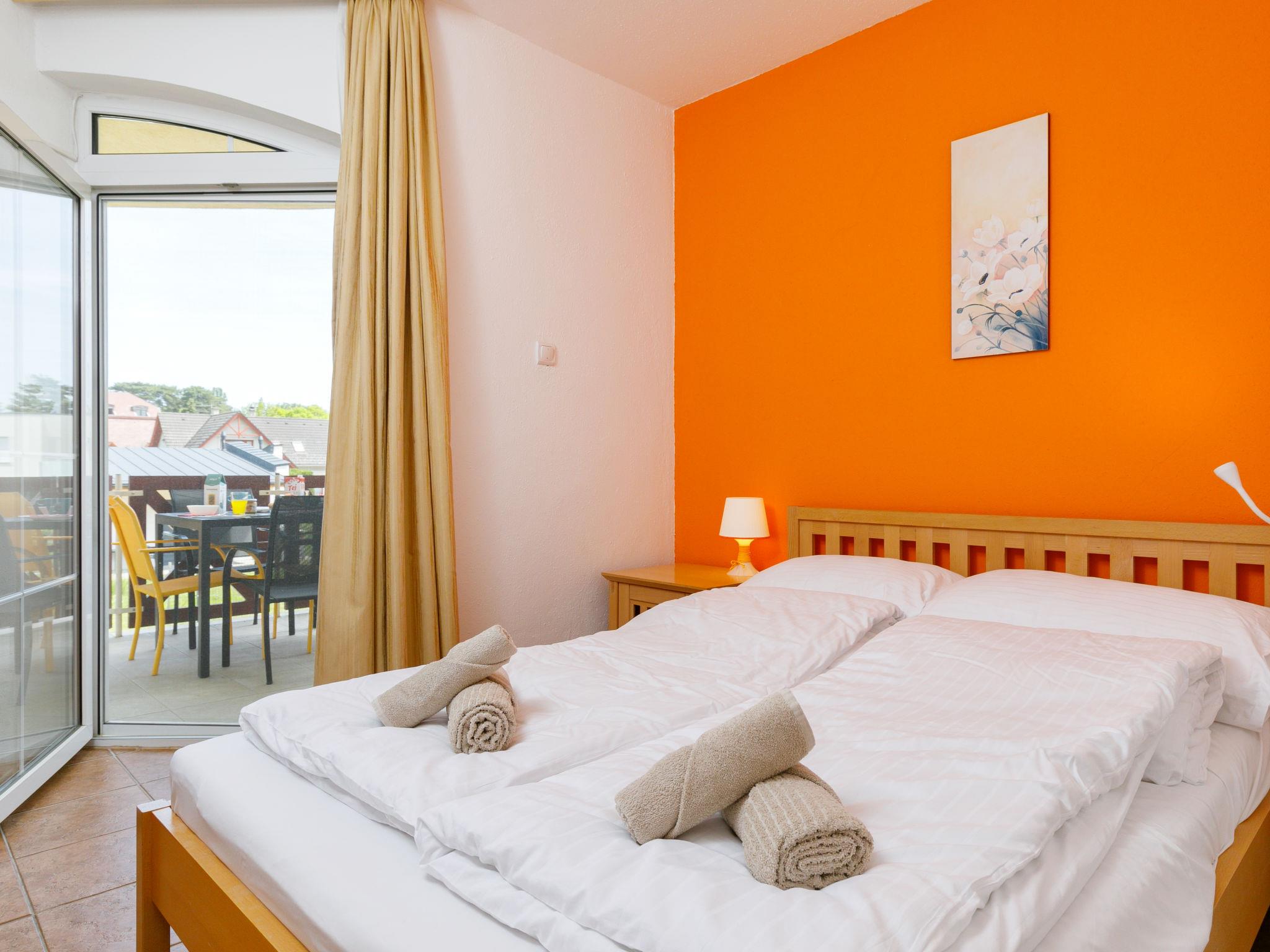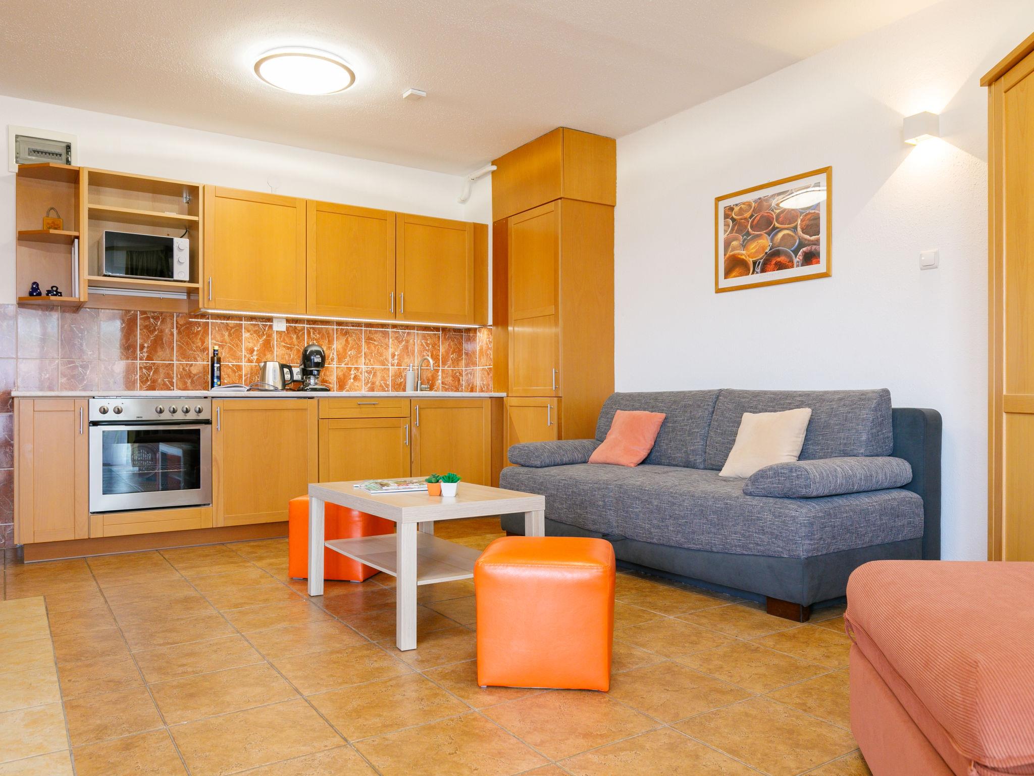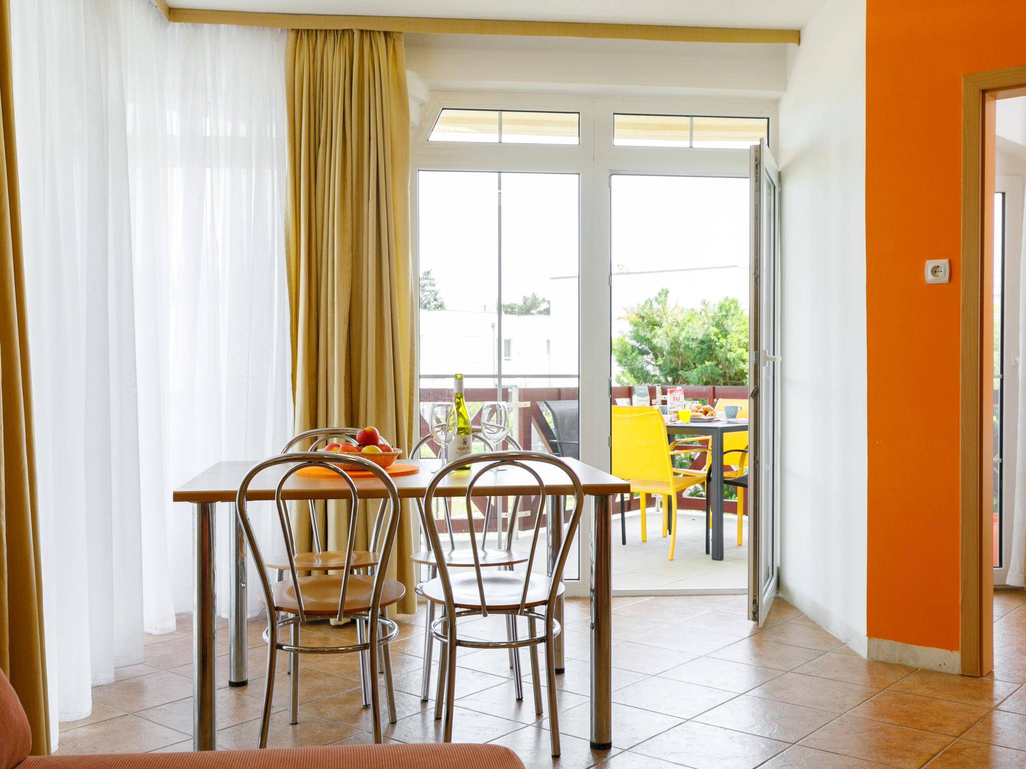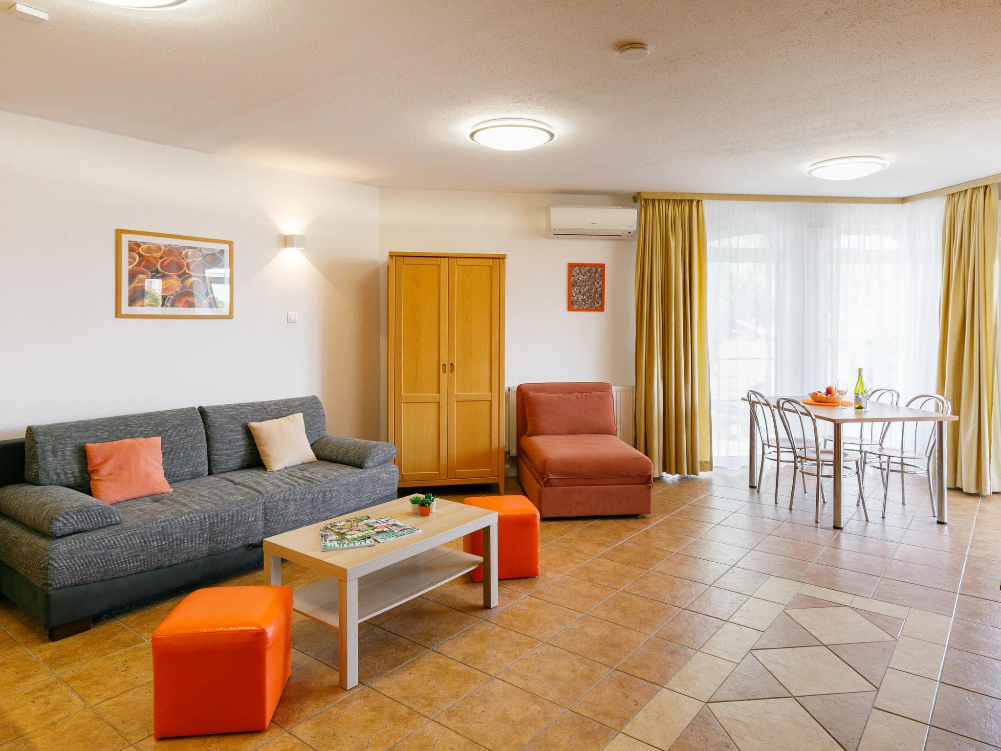 "Charlie", 2-room apartment on 1st floor, east facing position. Spacious and bright, comfortable furnishings: open living/dining room with 1 double sofabed (140 cm, length 200 cm), cable TV (flat screen), air conditioning. Exit to the terrace, east facing position. 1 double bedroom with 1 french bed (160 cm, length 200 cm). Exit to the terrace. Open kitchen (oven, 4 ceramic glass hob hotplates, kettle, microwave, electric coffee machine). Shower/WC. Heating (extra). Terrace. Terrace furniture. Facilities: mosquito net, children's high chair, baby cot (extra). Internet (WiFi). Please note: smoke alarm.
