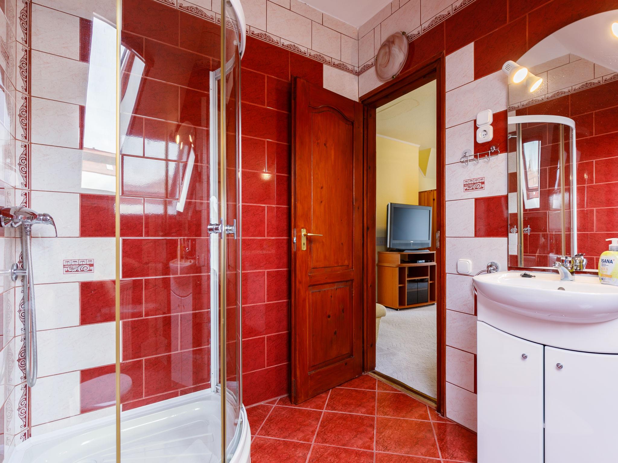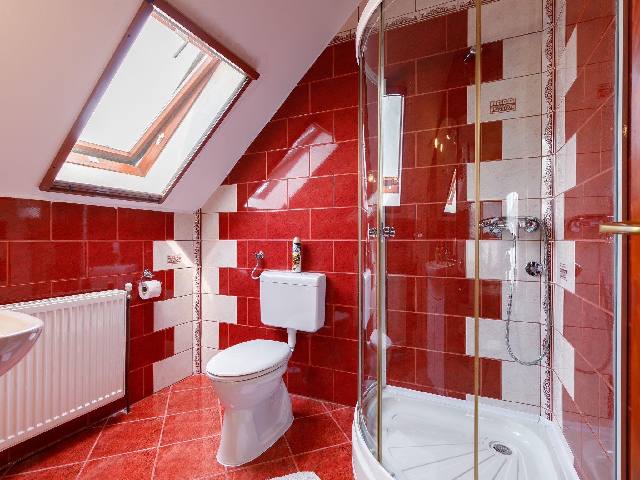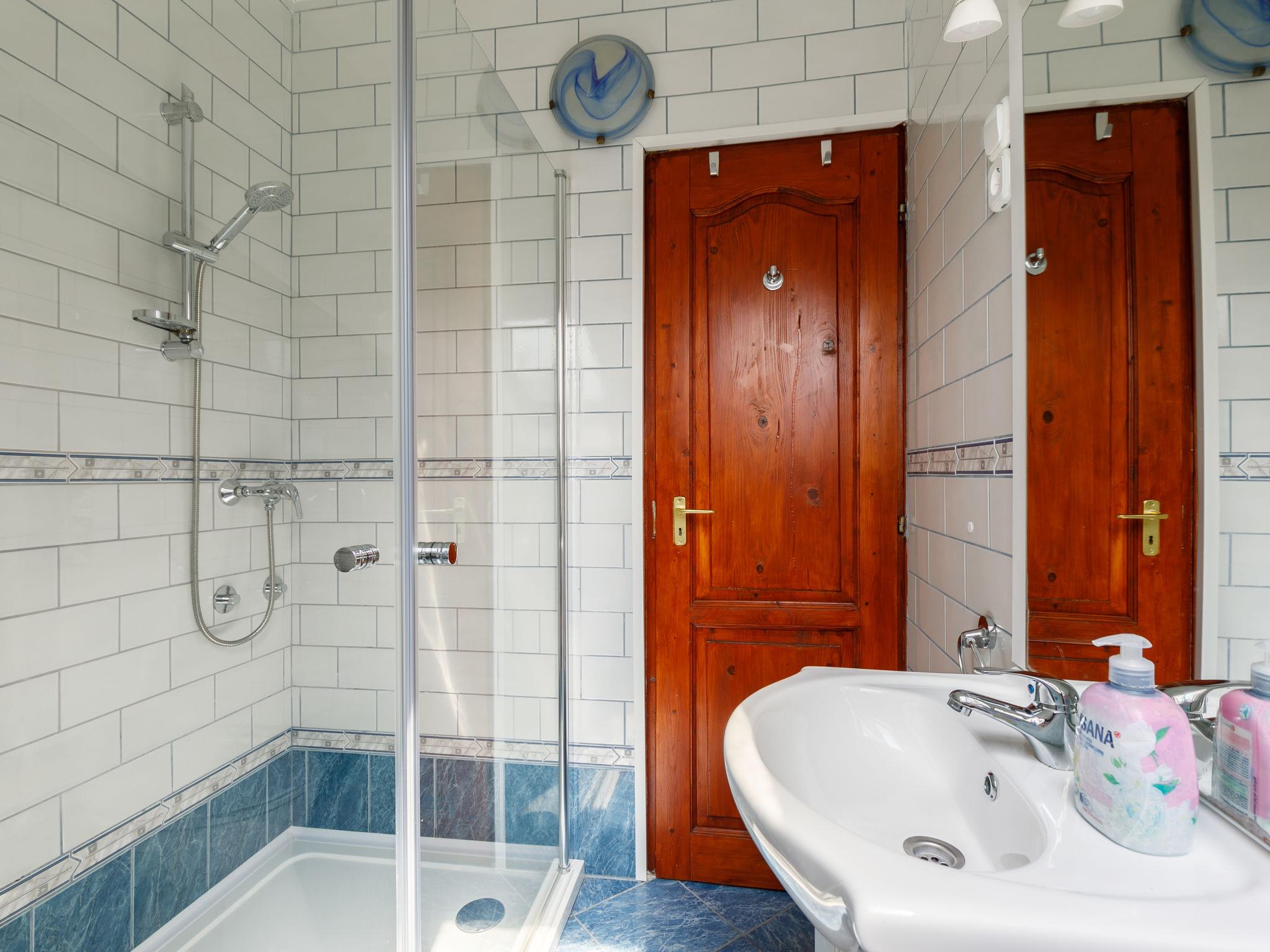 5-room house 160 m2 on 2 levels. Comfortable and cosy furnishings: living/dining room with satellite TV. Exit to the terrace. 1 room with 1 french bed (160 cm, length 200 cm), TV. Open kitchen (oven, dishwasher, 4 gas rings, toaster, kettle, microwave, freezer, electric coffee machine). Shower/WC, sep. WC. Upper floor: 2 rooms with sloping ceilings, each room with 1 double bed, shower/WC and satellite TV. Exit to the balcony. 1 room with sloping ceilings with 1 french bed (160 cm, length 200 cm), satellite TV. Shower/WC. No heating option. 2 balconies, terrace partly roofed. Terrace furniture, balcony furniture, deck chairs. Facilities: washing machine, children's high chair, baby cot (extra). Internet (WiFi). Please note: non-smoking house.